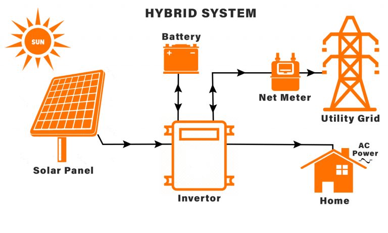 The Hybrid System is a grid-connected solar system with battery storage. It functions similar to an on-grid solar system. However, it uses batteries for energy storage for further use at the time of power demand peaks or low production due to less or no sunlight. Now that the battery prices are diminishing, the solar panel systems which is already connected to a grid can start taking full advantage of solar batteries as well. When the stored energy is fully consumed, the power grid acts as a backup, allowing users to use both powers.